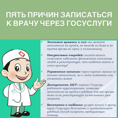Пять причин записаться к врачу через Госуслуги 🔗 gosuslugi.ru смотрите в карточке.